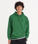 Soft cotton faced fabric. Brushed back fleece. Drop shoulder style. Double fabric hood with self colour drawcord. Front pouch pocket. Ribbed cuffs and hem. Twin needle stitching. Tear out label.
